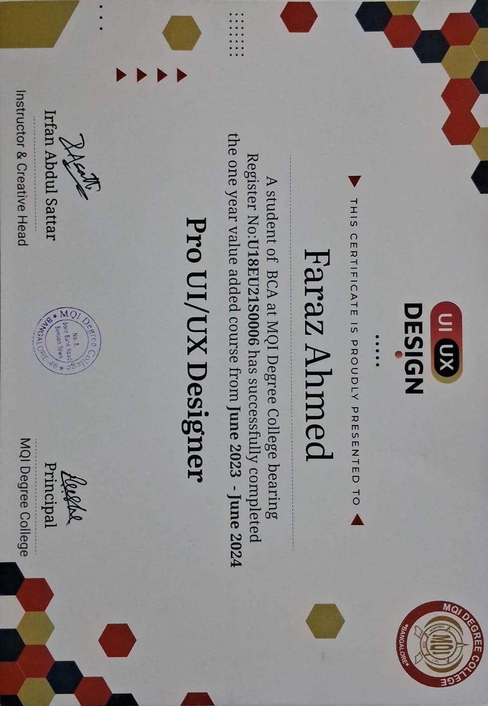 I completed a UI/UX design certification at MQI College, where I advanced my skills in user research, wireframing, prototyping, and visual design. The program focused on creating intuitive, user-centered designs, enabling me to apply professional design principles and best practices to real-world projects.